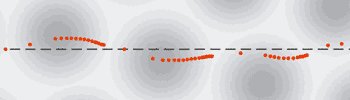 Fig. 3. During scanning the probe moves not only laterally turning round obstacles, but "sticks" ascending the potential maximums. Dotted line shows scan direction, red points correspond to the probe position in equal intervals.