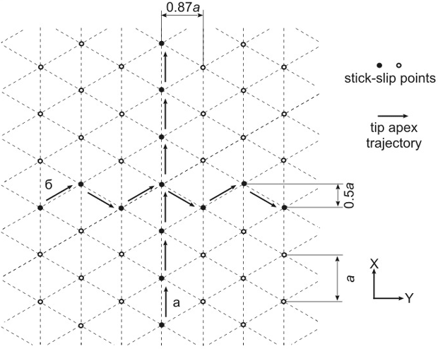 For the two-dimensional case, the motion has some features. The probe moves not only in the scan direction but from side to side in the Oy direction because the tip "slithers" down the potential humps sideways approaching the energy minimum.