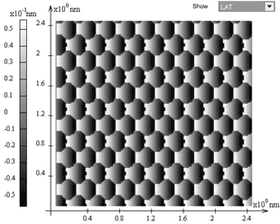 Notice that the appearance of well or not well resolved atomic structure at scanning in different directions is not the result of the numerical model but a physical effect revealed experimentally as well [4]. In Fig. 5 and Fig. 6 are presented the calculation results obtained for two scan directions relative to the lattice.