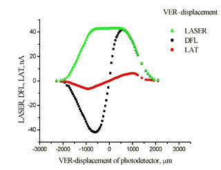 Experimental plots of the DFL and LAT signals vs. adjusting screws travel x and h are shown in Fig. 2.
