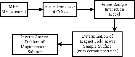 The last step of the chart (Fig.1) is the sample magnetic structure representation. To determine the studied surface magnetization (distribution of unit volume magnetic moment), the so called inverse source problem of magnetostatics should be solved. Remember that the forward problem is the field calculation from the known sources while the inverse problem is the sources positions determination basing on the information about the field structure. Thus, the inverse problem solution means determination of magnetization distribution across the sample surface under given magnetic field distribution in space. Because the field distribution has been previously rendered to some accuracy, the magnetization distribution will be rendered with a gross error. Moreover, in some cases the inverse problem can not be solved in principle. That's why another algorithm of MFM data quantitative interpretation is needed.