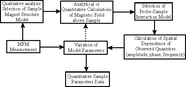 Further, we select a model of the tip interaction with an external magnetic field (these models are mentioned above) and within the framework of this model compute variation in detected parameters (phase, amplitude, frequency) having set previously the problem initial parameters: probe geometry, probe magnetization, tip-sample separation. Then, by varying the model unknown parameters depicting the sample magnetic structure, achieve the best agreement between calculation and measurement. These unknown parameters that provide the agreement represent the quantitative data about the sample magnetic structure. Sometimes, limited experimental data restrict the determination of the model parameters uniquely with high accuracy. In this case, according to the analysis results it is possible to limit the range of allowable values of the model parameters.