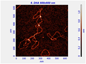 On cantilevers HA_ CNC probes obtain fairly stable resonance, so they can be used not only for supply but also for scanning in amplitude-modulation mode. For instance, with a HA CNC probe our engineer was able to obtain a good image of DNA chains in high resolution, which you can see below.