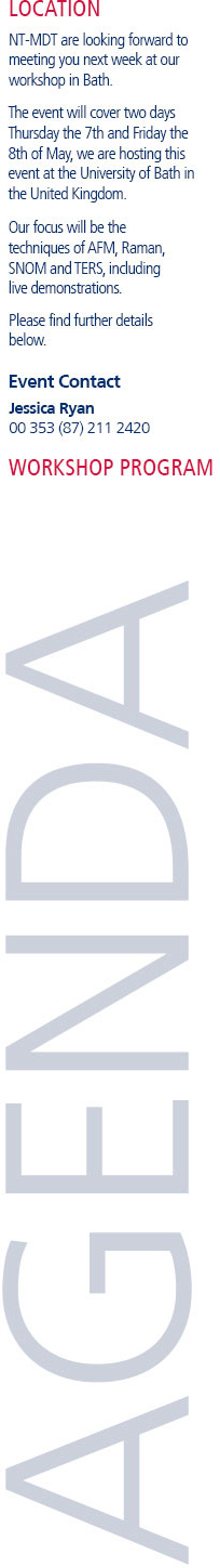 NT-MDT is excited to extend an exclusive invitation for you to participate in our Bath workshop at The University of Bath on Thursday the 7th and Friday the 8th of May focusing on the techniques of AFM, Raman, SNOM and TERS. The workshop will take place on the days following the University of Bath’s popular series of one-day imaging-related conference on Wednesday the 6th of May 2015. Please note separate registration is required for both events, those wishing to attend the meeting on the 6th should also contact u.j.potter@bath.ac.uk. In addition to the talks we will be able to provide and demonstrate measurements on the NTEGRA Spectra, and TITANIUM devices as well as introducing our new Thermal Chamber. We would also like to take the opportunity to invite you to join us for a conference dinner that will be held on the evening of Thursday the 7th May at 7.30pm for all speakers and attendees, venue is to be confirmed. NT-MDT WORKSHOP IS FREE OF CHARGE FOR ALL ATTENDEES. Please respond to Jessica Ryan ryan@ntmdt.ie to confirm your attendance. |