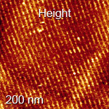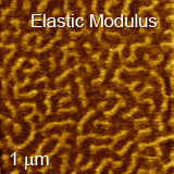 | Ongoing developments in quantitative nanomechanical (QNM) studies with the HybriD Mode have been publicized during the recent weeks in our latest Webinar and NT-MDT Workshops in Pittsburg (USA) and Frankfurt (Germany). Two major advances have been achieved during a thorough verification of quantitative mapping of elastic modulus on series of polymers. The first finding demonstrates that the values of the elastic modulus of polymers, which are extracted from the force curves during imaging of blocks of neat polymers, correlate well with their macroscopic data. This justifies the use of modulus mapping for compositional imaging of multicomponent polymer materials. The second result is the routine high spatial resolution of modulus mapping, which was achieved in studies of a number of polymers with lamellar morphology. Below, we present the elastic modulus map of diblock copolymer of polystyrene (PS) and poly(methyl methacrylate) - PMMA, in which the brighter lamellae correspond to high-modulus PS blocks. |