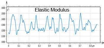 The elastic modulus spatial variations, as seen from the cross-section underneath the map, are in the 20-40 nm range that practically coincides with an AFM tip apex. |