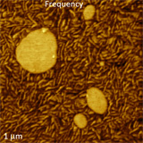 An example of such studies is given below with the frequency image and elastic modulus map of a blend of polystyrene and low-density polyethylene. The correlation between the frequency shift and elastic modulus is obvious. More applications of AM-FI and FM modes were reported during the recent Webinar on May 28th, and will be presented in the upcoming application note. Please visit: http://www.ntmdt.com/webinars/archive to view the recording and download the pdf of the webinar presentation.