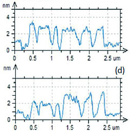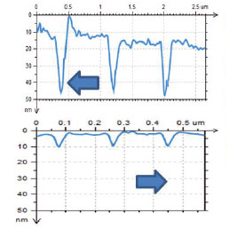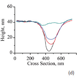 The important feature of AFM-based nanoindentation is that the indented locations can be visualized with high special resolution in the resultant images. The surface areas of PS, PC, SiLK and HDPE with the indentation marks, which we left by the AFM probe that deformed the samples with ~3 μN load, are shown in Figures 10a-d. The cross-section profiles, which were drawn in the vertical direction along the central row of the indents, are shown together with the height images. One can notice that high pileups are formed around the indents left in PS sample due to its plasticity, and they are practically absent in case of LDPE. Regarding the indent depth, it is the largest for the softer LDPE and the smallest for SiLK. The latter fact indicates a fast recovery of tip-induced deformation in this dielectric resin. Therefore, time-dependent effects should be taken into consideration during analysis of mechanical response of SiLK sample.