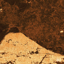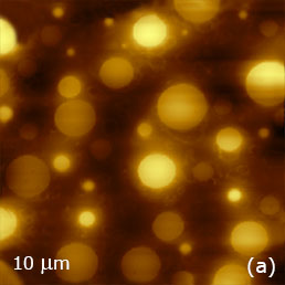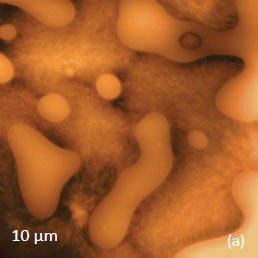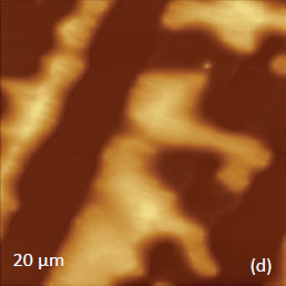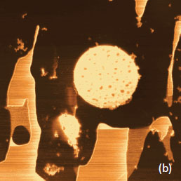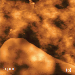 An example of the dynamic mechanical studies in the contact mode (the contact resonance technique), which were performed on a surface of high-density polyethylene partially covered with a flake of graphite, is presented in Figures 3a-c. In this contactresonance experiment a probe stays in the contact with a sample and the amplitude-versus-frequency spectrum of the probe, which is driven by a shaker, exhibits one or more contact resonances. As the probe scans over a sample surface the amplitude, phase or frequency of such resonances varies when the probe interacts with the locations of different stiffness. Basically the contact resonance shifts to higher frequency on stiffer locations. This effect is pronounced in the amplitude and phase images shown in Figures 3b-c. An edge of the graphite flake, which is recognized in the bottom part of the examined area (Figure 3a), shows the lower amplitude values and higher phase contrast as compared to the polymer in the top region. This is consistent with the fact that graphite (elastic modulus ~10 GPa) is stiffer component at this location. Furthermore, the phase image also exhibits the contrast variations on the polymer surface. This effect can be attributed to local variations of either stiffness or adhesion and it demonstrates a higher sensitivity of the phase response. A continuing interest to the contact resonance studies is also related with a possibility to explore the sample viscoelastic behavior [9] and thus to enhance the characterization of local mechanical properties of materials.