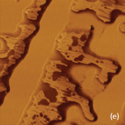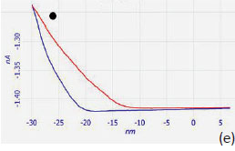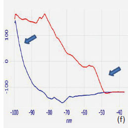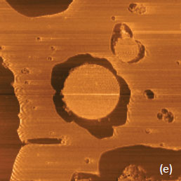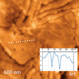 The contrast is difficult to interpret because of an additional complication related to the fact that a rigid substrate might influence the local thicknessof such 70-nm thick film. A comparison of the indents appearance and the cross-sections, which are presented in Figure 10c, points out that the matrix material is more plastic whereas the PVAC indents are smaller most likely due to their faster recovery. Another example is taken from studies of HDPE sample, whose surface exhibits developed lamellar structures with the individual lamellae being flat or edge-on oriented, Figure 11d. Several indents were made on flat-lying lamellae, and the remaining indents of 6-7 nm in depth are shown in Figure 11e. These values are close to the thickness of individual lamellae that was most likely penetrated by the tip. The loading and unloading traces recorded during the indenting of the lamellae (Figure 11f) are rather complicated. At the beginning of the loading path, which is indicated with a blue arrow, the deformation is elastic and it transforms into a small plastic part before climbing further. The initial deformation is quite similar to one that was reported in the indenting of the flat lamellae of the ultra-long alkane C390H782 [21]. The unloading portion looks more typical for deformation of semicrystalline polymers. The estimates of the elastic modulus for the loading and unloading paths in the regions indicated with the arrows showed that the elastic modulus of the initial deformation at least 50% higher. This can be expected because the polymer chains are oriented vertically in the flatlying lamellae and exhibit higher modulus compared to the bulk material with random orientation of polymer molecules. This example demonstrates the unique ability of AFM in studies of mechanical properties of the confined nanostructures.