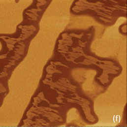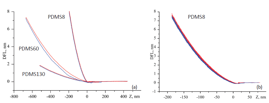 The phase image in Figure 12b, which shows a circle of PB at the former “blue” location, allows us to suggest that the PS domain was quite thin and was destroyed by the tip, which was attracted to the sample because of its relatively large size. The DvZ curves, which were obtained at small and large round-shaped islands of PS, have different shapes, Figures 12d-e. The curve obtained on the small island has two stages (Figure 12d) and this might correlate with a partial damage of the island as seen from the phase image in Figure 12b. The curve, which was collected on the black-colored location of the big island, looks common to those collected on the blocks of PS and other amorphous polymers. This example of the sample complexity shows that a comprehensive study of multicomponent materials can be quite difficult and likely requires the interplay between different methods and approaches.