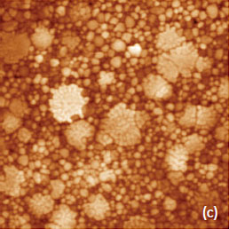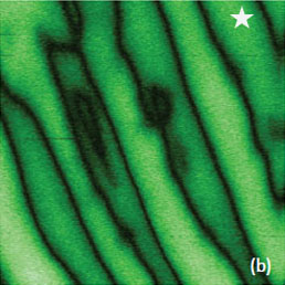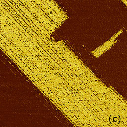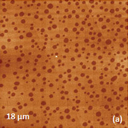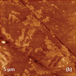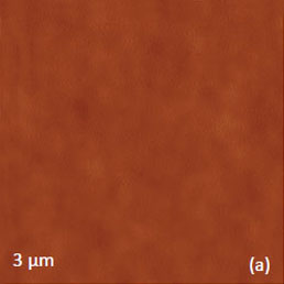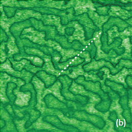 This work and the latter publication [18] presented a variety of TGS domain morphologies examined at different temperatures. These studies were performed with the probe scanned the sample in the contact mode with electric bias of 5 V at 40 kHz. The observation of the positively and negatively polarized domains, whose morphology does not affected by topographic features, was explained by detecting the electrostatic force variations caused by the surface charge density. This explanation is the alternative to the piezo-response effect. We have examined a single crystal of TGS of few millimeters in thickness. The crystal was cleaved to reveal a fresh surface (a-c plane). The height image of the surface reveals multiple patches with a depression slightly above 1 nm in depth, Figure 12a.
