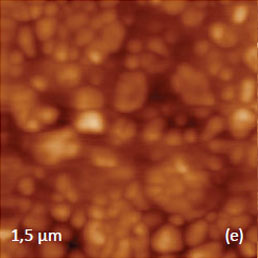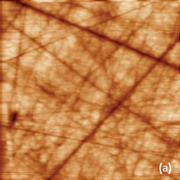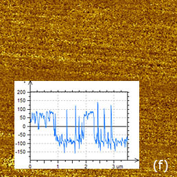 An application of PZT material for ferroelectric random access memories, which is justified by material large polarization and relatively reliable integration process, requires the improvement of the PZT fatigue and retention performance. The retention behavior is related to oxygen and Pb vacancies, and it can be improved by doping the material with lanthanum, niobium or other additives. A small addition (up to 10%) of donor dopant, like La3+ ions, enhance domain wall mobility leading to improved remnant polarization and also to lower dielectric constant and Curie point [12]. Characterization of PLZT material can be improved by PFM studies. As it was discussed above, a removal of a top contamination layer by a scanning probe opens a flat topography of the PLZT ceramic sample with a composition (Pb0.905La0.095 (Zr0.65Ti0.35)0.9575O3). The large-scale images (not shown here) show that the sample is composed of the grains of irregular hexagonal shape, which are typical for dense packing in hot-pressed ceramics. The largest grains have up to 10 microns in dimensions and a part of one of the grains is presented in Figures 7a-c. The height image of the sample reveals multiple polishing scratches (Figure 7a) whereas the domain morphology is clear distinguished in the VPFM amplitude and phase images (Figures 7b-c). Light and dark areas correspond to elongated wavy domains with opposite signs of the vertical polarization. This is evidenced by the 180-degrees steps seen in the phase profile in Figure 7d. The cross-section profile, which is made in the VPFM amplitude image, shows the depressed traces that represent the domain walls. These features are around 50 nm in width and they have a curved shape that is known as the domain roughness originated from the pinning of the domain walls by randomly distributed immobile defects. Domain walls should be flat in the absence of irregularities pinning the wall motion.
