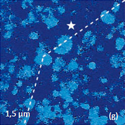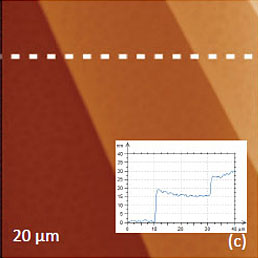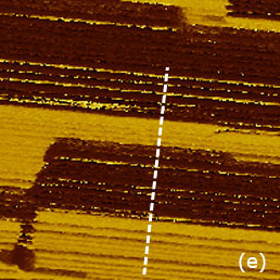 The situation changed after the crystal was heated to temperature above the material Curie point (49°C) and then cooled back to room temperature. As the height image of the annealed sample did not show changes (Figure 12c), the 180 degrees steps differentiate the domains of the opposite polarity appeared in the VPFM phase image, Figure 12d. The extended bright strips represent the parts of extended finger-like domains extended along the crystallographic a axis. The height and VPFM phase images of the larger area with 15-nm and 10-nm steps (Figures 12e-f) confirm that the domain morphology is practically independent from the surface topography. The slight traces of the topography cross-talk to the phase image are noticed only at the surface steps.