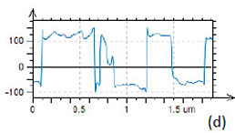 Figure 10. Height and PFM images of PPLN standard sample with the conducting probe with spring constant of 40 N/m. In the height image in (a) the surface corrugations are in the 0‑2.2 nm range. The amplitude variations in (b) are in the 0-0.25 nA range. The phase variations in (c) are in the 0‑350 degrees range. The crosssection amplitude and phase profiles across the polarized structure are shown in (d). The measurements were performed with the electric excitation 10 V at 30 kHz applied to the conducting probe with spring constant of 40 N/m