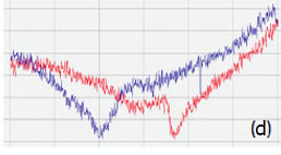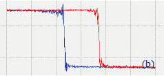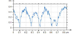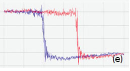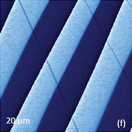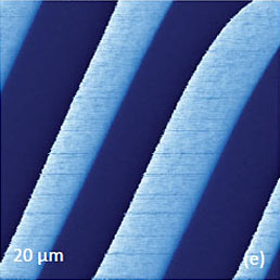 A similar specimen with parallel polarized domains is distributed by NT‑MDT SI as the standard for PFM training and applications. The height and PFM images of PPLN standard are shown in Figures 10a-c. A polished surface of this sample is very smooth and has no traces of the domain morphology, Figure 10a. The VPFM amplitude image reveals the domain pattern with two bright 5-μm wide “fingers”, Figure 10b. The image contrast reflects the minimal amplitude variations in the fingers and the matrix but well distinguished domain walls. The cross-section amplitude trace in Figure 10d indicates that the depressions representing the domain walls have a sub- 100 nm width. The pronounced phase contrast of ~180 degrees in Figure 10c points on the opposite polarization of the fingers and their surroundings.