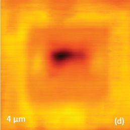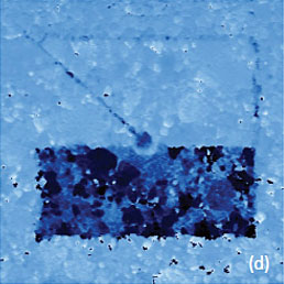This information is instructive when one wants to polarize the sample. One of the areas of PZT film was polarized by scanning the probe with DC bias voltage of 20 V, Figures 6a-b. The effect of polarization, its magnitude, and possible dissipation can be monitored in the PFM mode. The PFM imaging of a slightly larger area revealed that the polarized region exhibits a much stronger response compared to its non-polarized surrounding. This effect can be reversed by scanning the polarized area with the probe having negative bias voltage of -20 V. Such switching of the polarization was achieved in the top part of the polarized area as seen from Figures 6c-d.