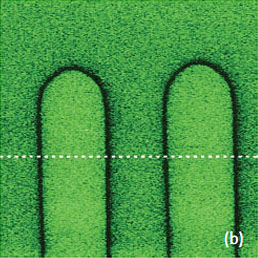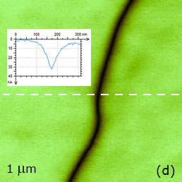 Due to possible imperfections of the lithographic mask, in some locations of the standard sample one can find domains with slightly rough walls as seen in Figures 11a‑d. This region with a smooth topography includes the differently polarized domains with high contrast amplitude and phase signals. The cross-section in the 1-μm amplitude image shows that the width of the wall at the half depth is ~50 nm. This value is larger than the domain wall thickness in the 5-15 nm range determined in single crystals of (Ba, Pb)TiO3 with electron microscopy [15]. The analysis of the broadening of the wall thickness includes the contributions of the probe dimensions and complex electrostatic interactions and depolarization field at the sample surface [16]. The questions regarding the spatial resolution of PFM measurements have been already addressed [17] but still is a subject of the debate.