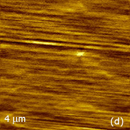 The repetitive scanning of this area helps cleaning the sample surface, which exhibits a number of polishing lines, Figure 3c. Remarkably, the VPFM phase contrast, which reveals the domain morphology of the sample, is much cleaner on the areas free from the adsorbate, Figures 3c-d. Actually, in studies with the probe, which is 240 micron in length and has spring constant around 2 N/m, the piezo-response in the phase images was most noticeable with the operation at the contact resonance near 364 kHz. More peculiarities of the PFM measurements will be mentioned in the analysis of the data obtained on different samples.