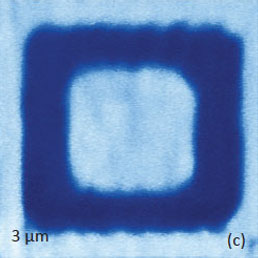 Figure 15. Height and PFM images of a monodomain BFO sample after a central 2-μm area was polarized by a scanning probe with +50 V bias and then the polarization of the inner 1-μm region was switched back by the scanning probe with -50 V bias. The surface corrugations in (a) are in the 0‑20 nm range. The amplitude variations in (b) are in the 0-7 nA range (b). The phase difference between the domains in (c) is around 180 degrees. The measurements were performed with the electric excitation 20 V at 20 kHz applied to the conducting probe with 2 N/m stiffness
