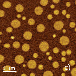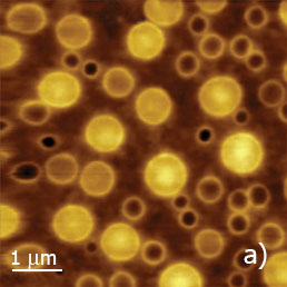 The height image of PS/PVAC film on the ITO substrate shows the morphology in which the circular domains of different height are embedded into a relatively flat matrix. Only small contrast changes are noticed on the domains and matrix locations whereas the domains’ edges are seen most pronounced.