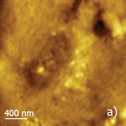 A number of bright nanoparticles seen in a central part of the height image can be assigned to carbon black fillers. The suggestion is strongly supported by the IR reflection image in which the carbon nanoparticles show extremely bright contrast compared to the polymer matrix.