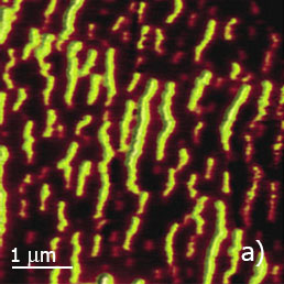 Another example is a grating in which the square-shaped SiO2 pads with lateral dimensions 1.5x1.5 µm and height of ~20 nm are grown on Si surface. The square blocks are well distinguished in IR images by a darker contrast compared to the Si substrate. This contrast reflects the differences between the real components (ε΄) of dielectric permittivity of these materials at 10.6 μm wavelength. The darker contrast of SiO2 pads in s‑SNOM map is consistent with lower value of its permittivity (εr=3.9) compared to that of Si (εr=11.7).