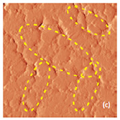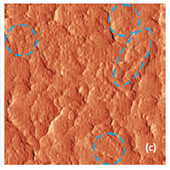 Phase and magnitude of cantilever oscillation recorded during scanning provide complementary information to AFM topography. Phase imaging shows a clear contrast once there is a detectable variation of interaction forces between cantilever and surface. Thus, phase images highlight grain edges and are not affected by large-scale height differences providing clearer observation of the sample fine features (Fig. 3c-d). Magnitude (cantilever oscillation amplitude signal) provide additional contrast (Fig. 3e‑f):