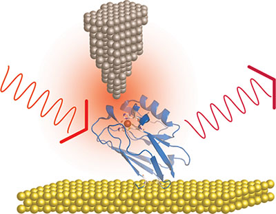 The copper protein azurin, due to the peculiar coupling of its optical and vibronic properties with electron transfer (ET) and its biorecognition capabilities, is a very promising candidate for bioelectronic, bio-optoelectronic and biosensor applications. However, a complete understanding of the fundamental processes relating azurin ET and its optical and vibronic characteristics with the charge transport mechanisms occurring in proteins bound to a conductive surface, the typical scenario for a biosensor or bioelectronic component, is still lacking. We studied azurin proteins bound to a gold electrode surface by scanning tunneling microscopy combined with TERS. Robust TER spectra were obtained, and the protein’s vibronic response under optical excitation in resonance with its ligand-to-metal charge transfer band was found to be affected by the tunneling parameters, indicating a direct involvement of the active site vibrations in the electron transport process.