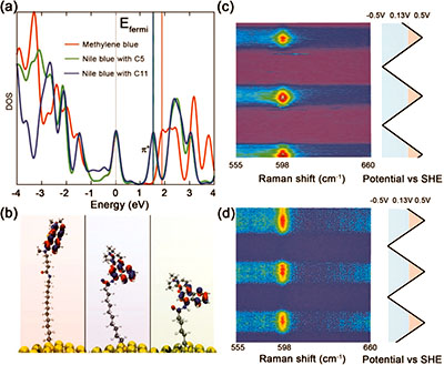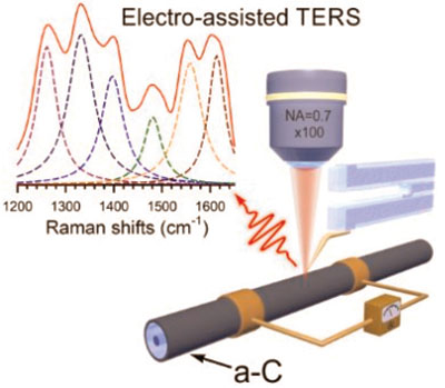 Tip-Enhanced Raman Scattering (TERS) represents an advanced spectroscopic tool that enables probing a specimen on scales far beyond the diffraction limit. An investigation of two- dimensional systems reveals a striking feature of TERS, when the near-field intensity is governed by the 8th and 10th power of the tip–sample distance for the coherent and incoherent scattering cases, respectively. We demonstrate spectrally resolving capabilities of coherent TERS spectroscopy when studying electrically biased amorphous carbon films. Local electro-annealing at hot spots was found to activate temperature-dependent molecular transformations such as an expansion of the defect-free sp2 domains network at temperatures above 400 °C. Electro-assisted TERS allows one to directly visualize the presence of water-decorated carboxyl/hydroxyl groups at the edge carbon atoms.