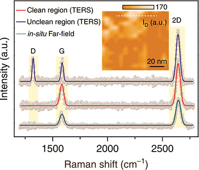 Among the various methods for graphene synthesis, chemical vapour deposition (CVD) approach holds great potentials in the scalable and cost-efficient production in a controllable fashion. Typically CVD graphene consist of unavoidable contamination on the surface during the growth process. Confocal micro Raman does not allow identify defect regions as amount of defects is not so large. Thanks to local enhancement and few nm lateral resolution by TERS technique one can clearly identify regions with defects (bright color on the map) and without (dark color on the map). It is possible due to strong D-band in the TERS spectra (upper spectrum) produced by defects. On the image there are TERS spectra of the unclean (blue line) and clean (red line) graphene regions in unclean graphene sample with Lorentzian line fit analysis, and in-situ far-field Raman spectrum of graphene in the same region (dark cyan line).