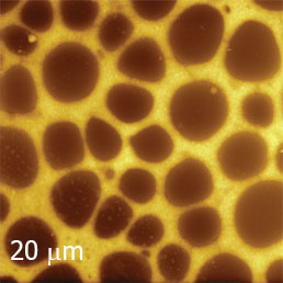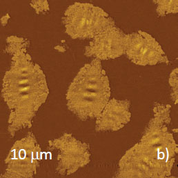 Such binary morphology has been observed in thick and thin bitumen adsorbates, in which the ratio of these components is different. In thick adsorbates the bees-containing domains occupy a half of the surface area (Figure 13a), and in thin layers these domains present the minor component (Figure 13b).
