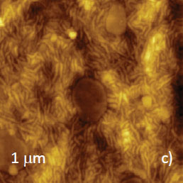 Analysis of bitumen surface has revealed that the ‘bees’-containing domains alternate with the “bees”-free areas that are dissimilar in some properties. This composition is best observed in frequency image with a pronounced contrast in Figure 12b.
