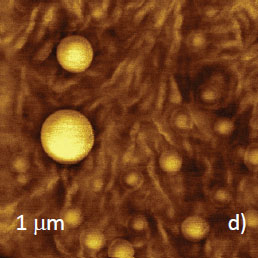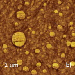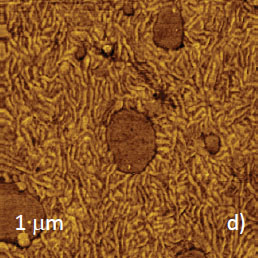 This is confirmed by HybriD ModeTM study (Figures 6c‑d), in which the probe exerts a stronger force and depresses soft surface structures. This made lamellar structures visible, particularly, in the elastic modulus map, Figure 6d. Therefore, the matrix is enriched in LLDPE. The circular domains, which are bright in the phase image, exhibithigher modulus and can be assigned to PS.