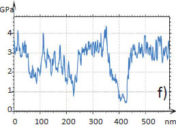 Surface locations, which are dominated by one of the components, were observed in film of PS/HDPE blend. In first case, a central sub-micron domain and three small nano-scale domains of HDPE are inserted into PS matrix, Figures 7a-b. This assignment is justified by the analysis of the elastic modulus map, which shows a softer nature of the domains. Lamellar structures, which are distinguished inside the central domain in the map, confirm this conclusion.