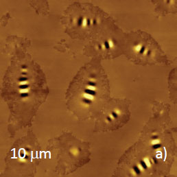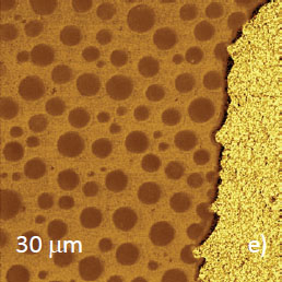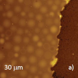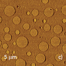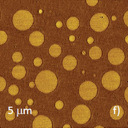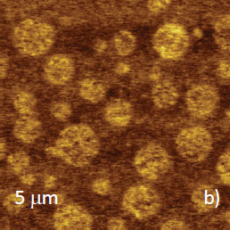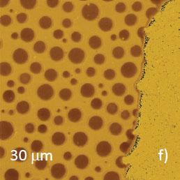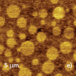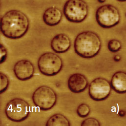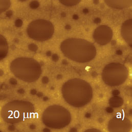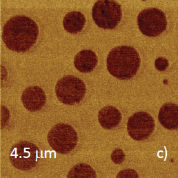 Microphase separation of the components in film of immiscible PS/PVAC blend leads to surface circular structures embedded in a relatively flat matrix. This morphology is seen on the left side of the height image in Figure 8a. A scratch on right side was made with a sharp wooden stick to open the glass substrate. By profiling the polymer/substrate step we determined that the film is ~80 nm thick. The domains, wich are few microns in diameter, are different in height, with most being raised up to 15 nm