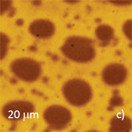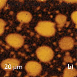 The final confirmation of the assignment of the circular domains to PVAC and matrix to PS was obtained in AFM/Raman study. The maps of intensities of Raman scattering bands specific to the components, which were recorded together with height image, are presented in Figures 10a-c. The spatial resolution of Raman maps is inferior to the resolution observed in the frequency, phase images and in elastic modulus map. However, the chemically-specific information provided by this technique is unique. We are expecting the improvements of spatial resolution and further progress of this fast developing method and its counterpart – AFM/IR technique.