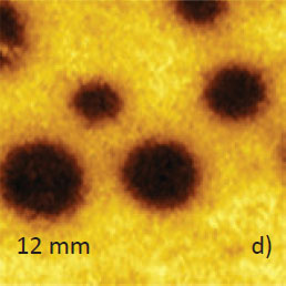 We are completing the description of compositional imaging with the example of the concert study of a surface location where the asphaltene domain is surrounding by wax material. The area was examined in four AFM modes as shown in Figure 14a-d.