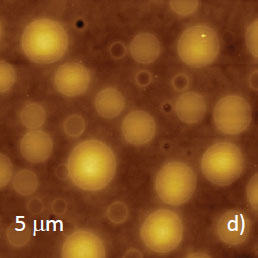 These extended shapes with lateral dimensions of several microns in length and vertical corrugations of up to 200 nm are shown in Figures 12a‑b. The “bees” are more common for surfaces of relatively thick adsorbates, and differently shaped structures are found in thin layers with thickness below 0.5 micron, Figures 12c-d.
