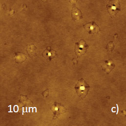 One can expect that in water hydrophilic polymer swells and changes its volume and mechanical properties. This is confirmed by the HybriD ModeTM data obtained on PS/PVAC film in water, Figures 9a-c. The shapes of circular domains have changed, and small depressed locations were noticed inside these domains, Figure 9a. The water-induced changes of the local elastic modulus and phase were more drastic. Softness of the circular domains and their phase contrast in water are similar to those observed in air at high temperature. In other words, water plays a role of plasticizer, which lowers effective Tg of hydrophilic PVAC.