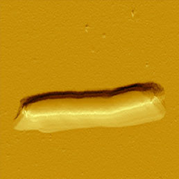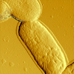 The size of bacteria is usually almost an order higher than the size of virus particles. The easiest way to visualize bacteria by AFM is scanning in air. Sample immobilization is as simple as to dry the suspension of bacteria onto a glass cover slip or mica surface. Using this method the bacteria are immobilized rmly enough to scan them even in contact mode, however, semi-contact mode is preferred where even the amplitude or phase can be recorded (see Fig.6).