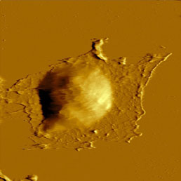 Because the cell membrane is very soft, less sharp probes (i.e. non sharpened silicon nitride probes) are recommended for imaging of living unxed cells to prevent tearing of the membrane. Softness of the membrane allows even visualization of the cytoskeleton underneath the cell membrane (Fig.8). This can be achieved easily in contact mode, where the increasing force applied to the tip enables visualization of the cytoskeleton under the cell membrane appears [16], but also in semi-contact mode by great reduction (40%) of free amplitude [17].