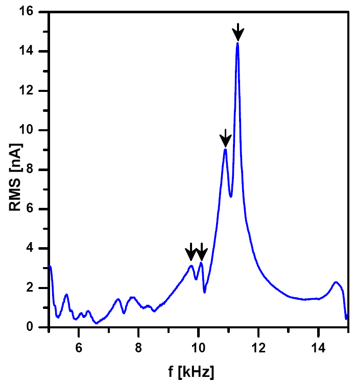 The resonance frequency of the cantilever in liquid is usually an order of magnitude lower than in air and is located bellow 20 kHz. Auto-tuning is not recommended in liquid, because in contrast with resonance frequency in air there is not only a single peak in liquid environment (see Fig.2). After initial frequency sweep (from 5-20 kHz), multiple peaks appear on the plot. It must be noted that the resonance frequency of the tip in liquid is not only a property of the tip, but rather of the entire environment. The selection of proper peak can be a challenge for beginners and would resemble more art than science. There are several recommendations for the proper selection: