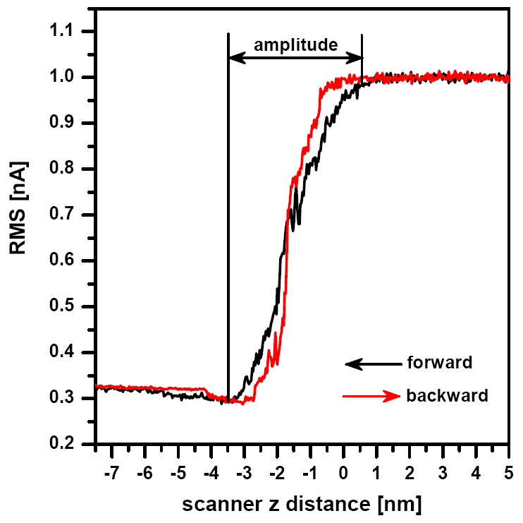 Fig.3, a typical response curve of the cantilever (RMS signal) can be seen during the process of approaching. At the beginning, the rising amplitude of the cantilever slows down the approaching speed (controller switches to ne approach mode) and that is why the approaching procedure needs to be several times restarted (marked with arrows). When the cantilever comes very close to the surface the amplitude starts to decrease. This mild decrease does not mean that there is a contact with the sample surface. At the end, there is a sudden drop in the amplitude, hitting the applied set point, which means that the tip reached contact with the sample. As well as the tuning, the landing procedure needs also some training and a good sense to set a proper set point and feedback gain.