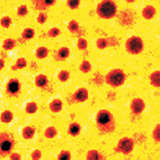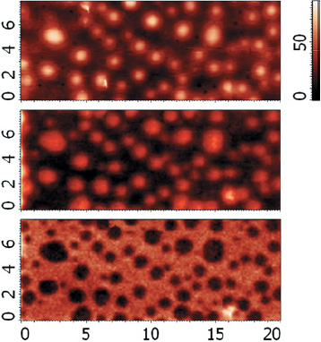 The height images reveal a phase-separated morphology with circular and elevated domains of the polar component immersed bright patches of these regions in surface potential, the strong dC/dZ contrast on these domains and their selective swelling in humid and methanol atmosphere [5].