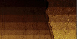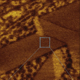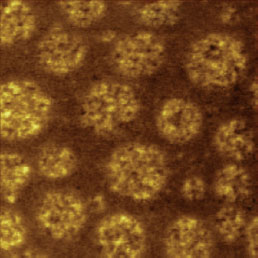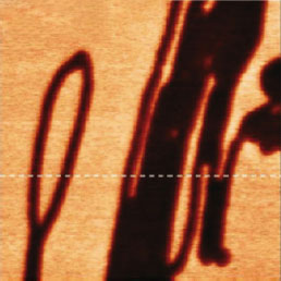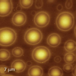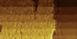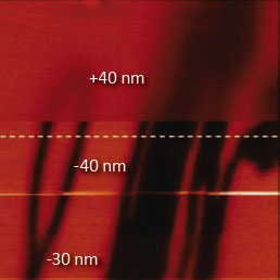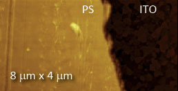 F14H20 adsorbates on silicon yield distinctive surface potential contrast, seen in the surface potential image shown to the right. The negative potential contrast is noticed only at the domains whereas small particles are not visualized in the surface potential image. The lack of small particles in the surface potential data is a strong indication that there is no noticeable crosstalk between the mechanical and electrostatic forces in the single pass operation. The same particles and F14H20 domains are seen in the dielectric response image; this is expected because any material between two electrodes will change the capacitance gradient.