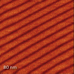 High sensitivity and spatial resolution can be achieved in single pass KPFM-PM studies as demonstrated in the images of F14H20 self-assemblies on graphite. The large scale height image shows a number of flat lamellar sheets and numerous droplets dispersed between them. The non-covered substrate patches are seen as the bright regions in the surface potential image. With the F14H20 adsorbates on graphite, the first layers are formed of molecules, which are oriented parallel to the substrate and form lamellar structures of 6–8 nm in width. The molecular dipoles in these layers are also preferentially oriented parallel to the surface. The high-resolution height and surface potential images (80 × 80 nmscan area) revealed lamellar patterns with height corrugations in the 300 pm range and potential changes in the 10–20 mV range. The spatial resolution of these images, which show the 6 nm spacing, is around a few nm as judged by a width of the dark strips. The nature of the nanoscale surface potential variation is under further investigation.