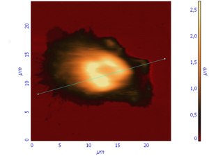 Fig.2 Living polymorphonuclear neutrophils and profile of living cell in liquid obtained in semicontact mode with contact Si probes CSG 11. Scan rate about 2 line/sec