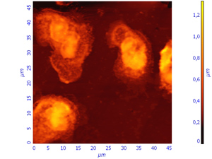 Fig.3 Polymorphonuclear neutrophils fixed by methanol on air obtained in contact mode with contact Si probes CSG 11. Scan rate about 1 line/sec