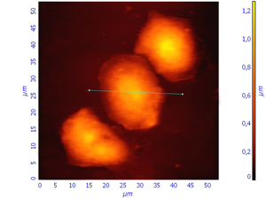 Fig.1 Living polymorphonuclear neutrophils and profile of living cells in liquid obtained in semicontact mode with contact Si probes CSG 11. Scan rate about 2 line/sec